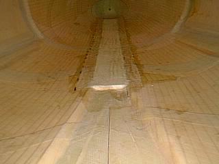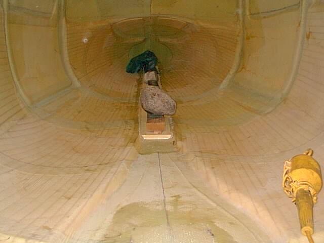 Fuselage bottom join - foam in slurry on top of first layer - wood/rocks (clean) hold things down. NACA scoop space left as is.: