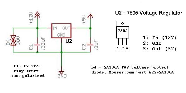 those may help to "quiet" the circuit.I did not mount my voltage regulator on a special circuit board but simply screwed it to the side of the box on top of a sink tab - a simple strip of tin about two inches long to disperse the heat (works fine). All the connections are simply soldered to the 7805 tabs, the switch, etc.