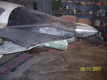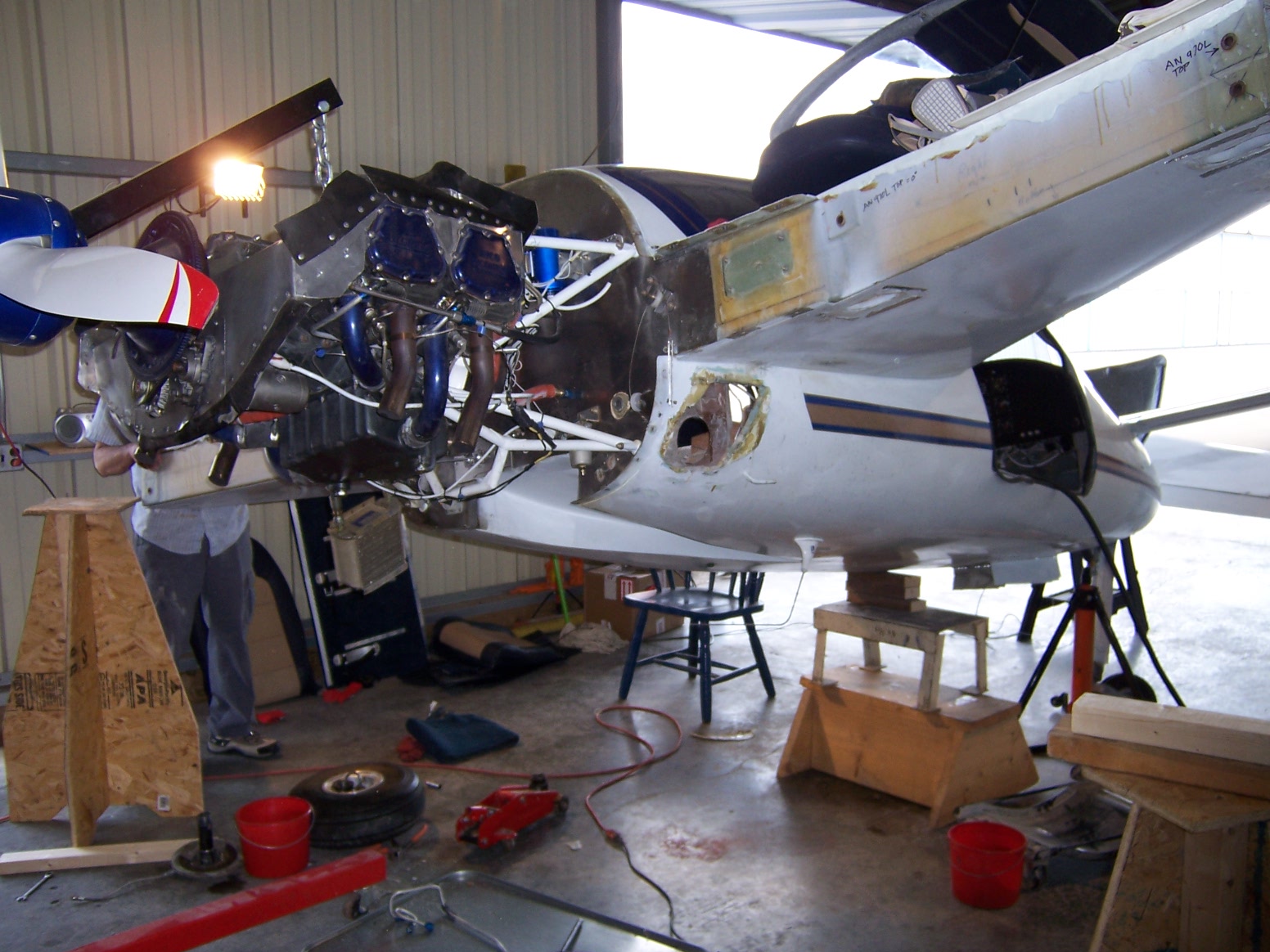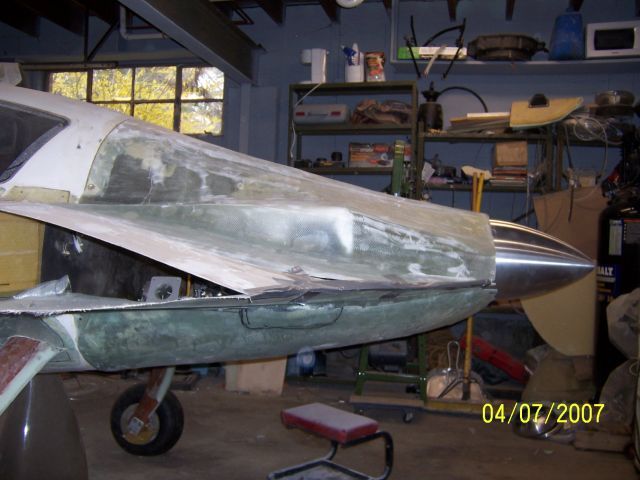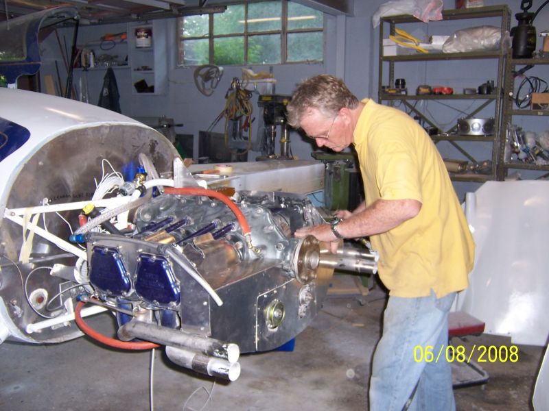 04/08/07 David's got the engine in place with almost finished cowling. The
