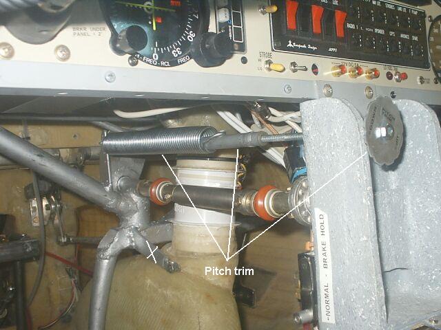 which did not fit with the yoke assembly.The left photo shows my $15 pitch trim solution - a spring with a screw jack for the threaded rod with a slightly re-shaped 2" fender washer as an adjusting knob. Not seen is a locknut about 3" on the threaded rod in front of the washer that is held against a metal plate on the lower console front vertical part. With a little bit of grease the system seems to work fine. 12/07/04: Still in the garage. Fussing with any adjustments and refinements I can find. Weather averaging about 20F is not the ideal for flying anyway.
