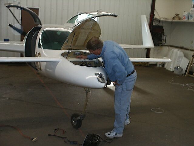 Inspection Day: March 17, 2004.FAA inspector Gary Soldwisch, hard at work. Inspection completed next morning with some minor regulatory adjustments. Gary was very helpful with suggestions of other phases of aircraft and flight and not just the inspection. A few things yet to adjust to get plane ready - the poor idling, ordered Prop-Guard leading edge protection to replace the thin stuff that came with the prop. Contacted Stan at KLS for some flight training they promised. Just my luck... Apparently, recently the factory plane landed in a storm and busted the landing gear, prop and a wing part. Most recent news is they are just waiting for a wood prop they ordered - custom carved. | ||